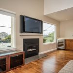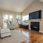 boxes. The bright and airy living room features Brazilian Oak hardwood flooring, vaulted ceiling, gas fireplace, built-in speakers and wet