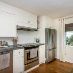 the refreshed kitchen with stainless steel appliances which compliments the original character of the rock fireplace and vintage